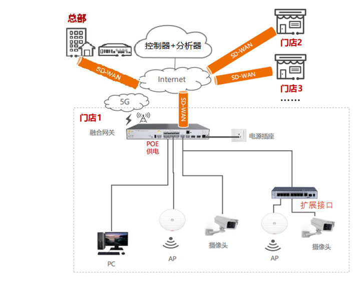 - 分支機構極簡組網,設備成本下降30%。6合1極簡組網,1臺網關,集交換機、IPS、防火墻、5G、路由器、無線控制器6種設備能力。